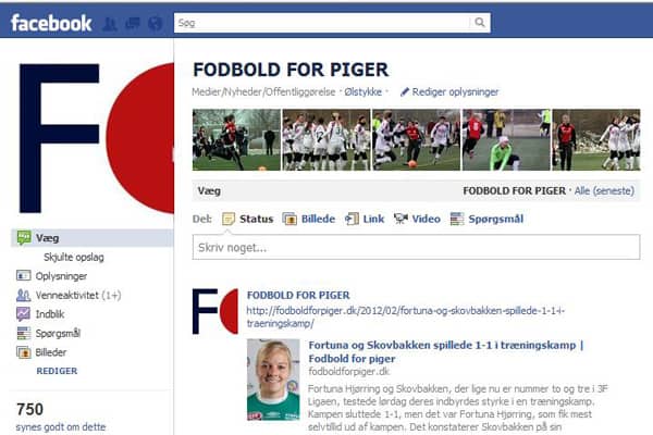 Interessen for FODBOLD FOR PIGER vokser støt og roligt på Facebook. Det er fire måneder siden, vi gik i luften, og nu er antallet af ”synes godt om” oppe på 750. Det er vi rigtig glade for, men vi er jo sportsfolk, så målet er selvfølgelig at nå endnu højere op.