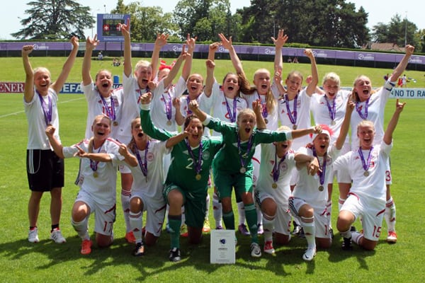 Sådan ser et fodboldhold, der lige har vundet EM-bronze ud. Billedet er taget i minutterne efter, at det danske U17-landshold fredag fik overrakt medaljerne efter 5-4-sejren over Schweiz i bronzekampen ved U17 EM i Nyon i Schweiz.