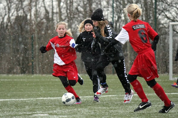 FOTO: Brøndby i sort fik solid modstand fra de rødblusede U11-piger fra Ølstykke, som ikke lod sig gå på af, at der var U13- og U14-piger med på Brøndbys hold. Foto: Steen Trolle