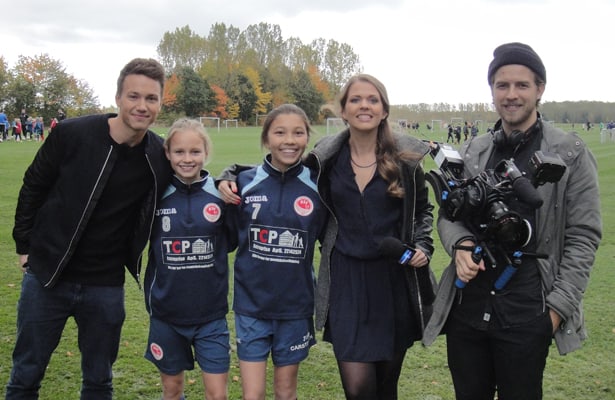 Foto: Josephine “Hasbo” og Mie fra BSF U15-1 Piger sammen med Videofotograf og tv-værterne fra tv3 Sport Golazo i Ballerup Idrætspark