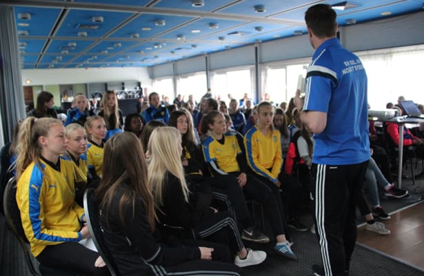 Ca. 200 piger havde takket ja til tilbuddet om dag i pigefodboldens tegn, og de skabte ikke bare en forrygende stemning til 3F-kampen. De fik også en masse input og inspiration med hjem om kvindefodbold. Ud over fodboldkampen var der nemlig også forskellige aktiviteter i løbet af dagen, bl.a. foredrag af U16- og U17-landstræner Danny Jung, som fortalte om vejen til talenthold.
