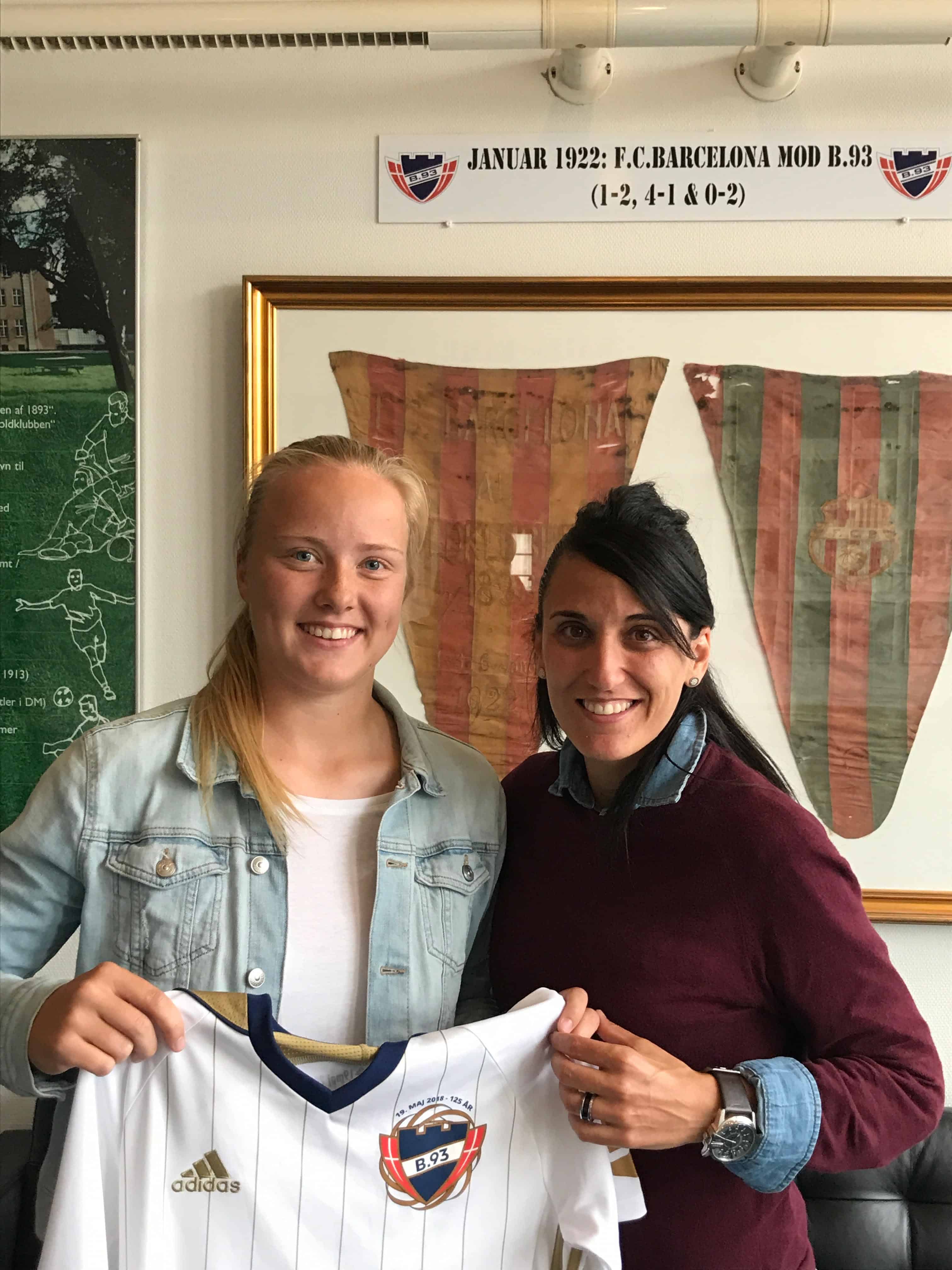 ”Jeg ser frem til en spændende sæson og et godt samarbejde med et nyt trænerteam,” siger hun. ”Mine nye holdkammerater har allerede taget godt imod mig,” tilføjer hun med et smil på læben, mens hun viser B.93´s jubilæumstrøje frem foran de gamle historiske flag på B.93 klubvæg fra den gang, hvor klubben mødte FC Barcelona.