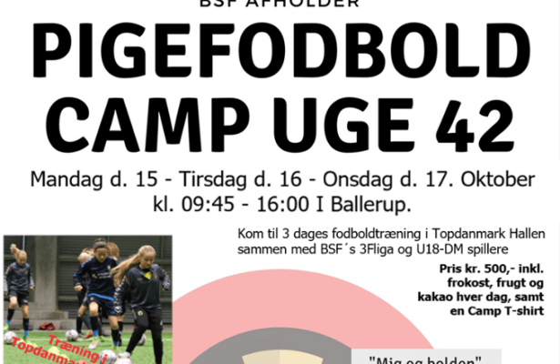 Brænder du så meget for fodbold, at du har lyst til at bruge et par dage af din efterårsferie på driblinger og skudtræning sammen med andre fodboldpiger? Så er BSF pigecamp måske noget for dig. I uge 42 afholder Ballerup-Skovlunde Fodbold nemlig en tredages camp kun for fodboldpiger, der gerne vil blive bedre til at drible, sparke og øge deres tekniske færdigheder.