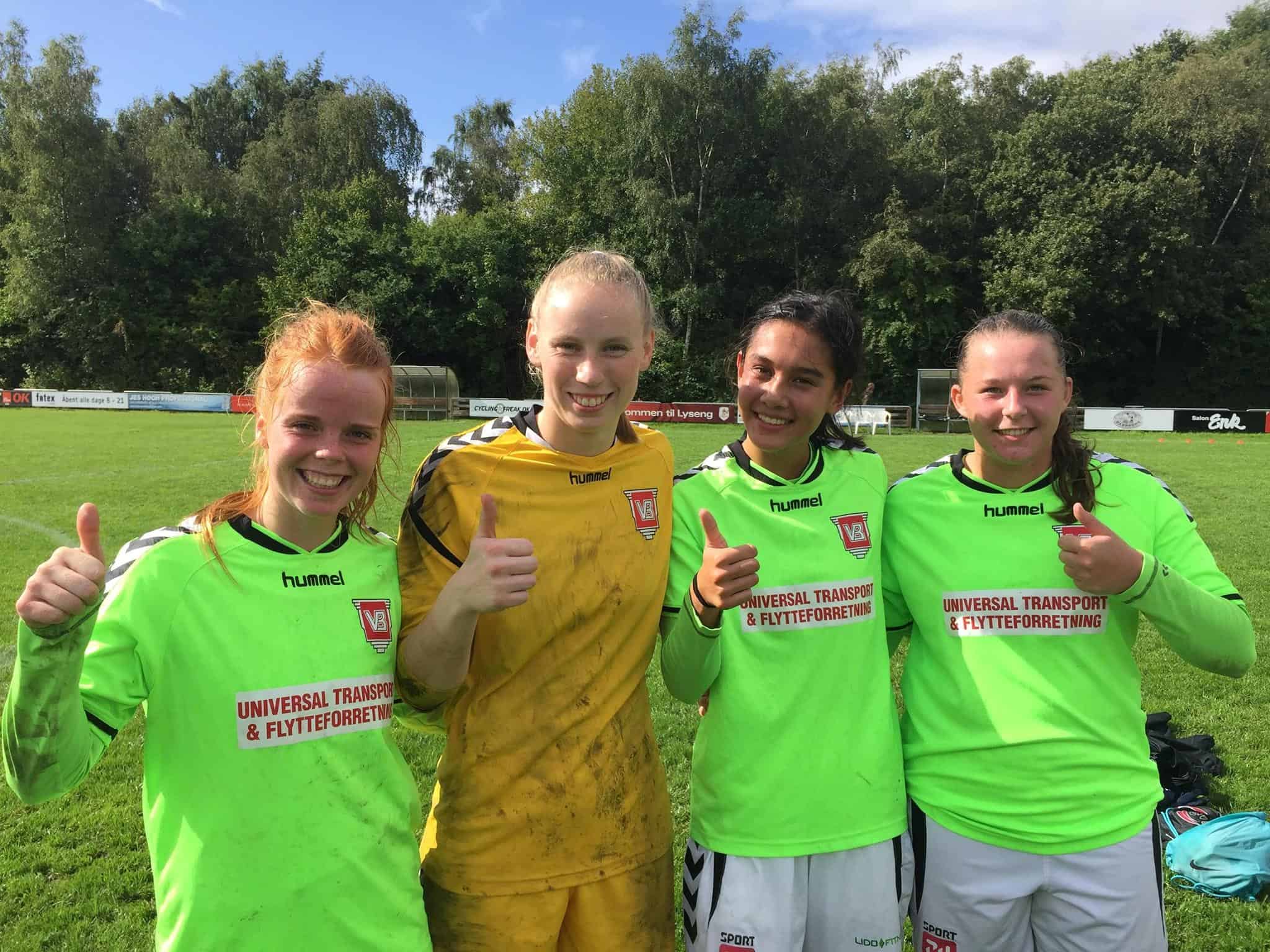 På billedet ses i udebanetrøjerne de tre glade målscorere fra 1. divisions sejr i Lyseng, Nadja Bryld, Cecilie Themsen og Marika Skov samt keeper Vibeke Juhl Jensen. Det var VB’s bedste holds første sejr i efteråret.