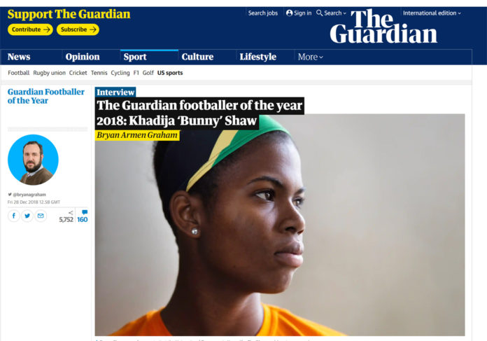 Khajida ’Bunny’ Shaw er kåret til The Guardian Footballer of the year 2018 – en pris, der gives til en spiller, som har været et ekstraordinært sportsligt eksempel over for andre. Det 21-årige talent har formået at opbygge en karriere i amerikansk fodbold, mens hun har mistet en bror i et færdselsuheld, tre brødre til bandekriminalitet og resten af hendes familie har kæmpet med dagligdagen på Jamaica.