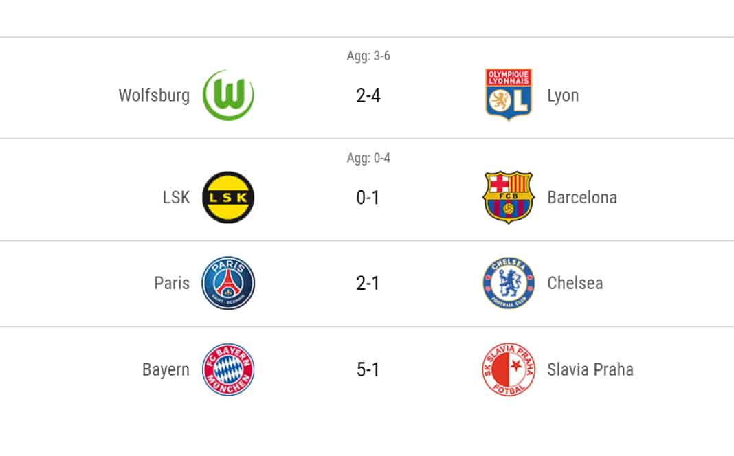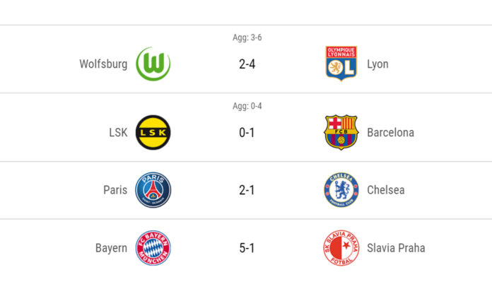 Bayern München vandt stensikkert 5-1 over Slavia Prag, som ellers havde 1-1 med fra Prag. Barcelona kunne nøjes med 0-1 ude mod LSK Kvinner, som spanierne vandt 3-0 over i den første kamp. Endelig klarede Chelsea sig videre mod Paris Saint-Germain, som ellers vandt 2-1 i den sidste kamp hjemme i Paris. Men efter 2-0 til Chelsea i London, var det ikke nok.