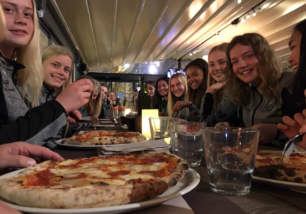 U17-landsholdet har netop kvalificeret sig til EM med en sejr på 5-0 over Italien ved Elite Round, og nu er Freja og holdkammeraterne på vej i bussen til en restaurant, hvor EM-billetterne skal fejres med ægte italiensk pizza.
