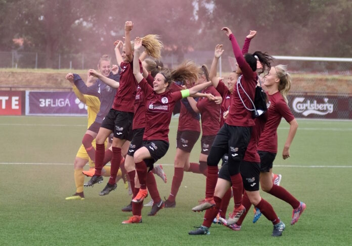 ”Vi skulle jo vente efter kampen på, at opgøret i Farum skulle spilles færdig, hvilket var rigtig frustrerende. Så vi kunne ikke rigtig glæde os for tidligt, men vi fik sunget og drukket et par øl. Da vi endelig fik nyheden om, at vi var rykket op, gik folk helt amok,” siger hun og fortæller videre, hvordan de fejrede pladsen i 3F Ligaen: