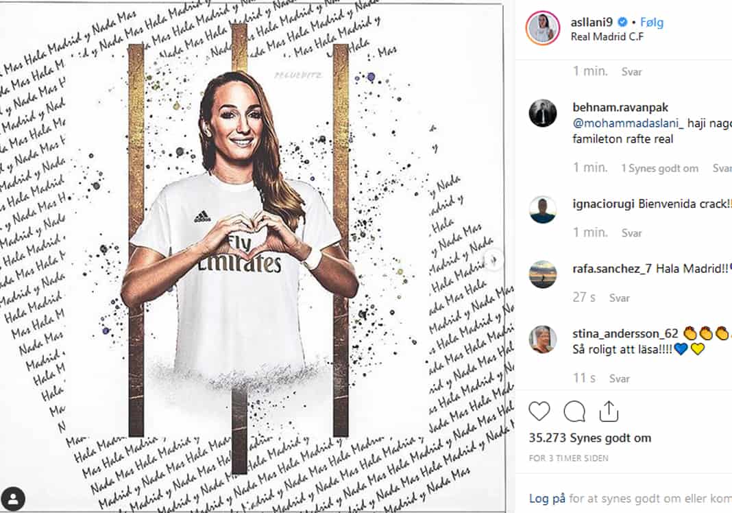 “Jeg er stolt over at kunne fortælle, at jeg er den første officielle hvervning for Real Madrid/CD Tacón. Jeg er spændt på at skull evære med til at skrive historie og bygge og være en del af dette holds rejse fra starten,. Det er en drøm at bære den smukkeste skjorte i verden fra næste sæson,” skriver 29-årige Kosovare Asllani på Instagram.