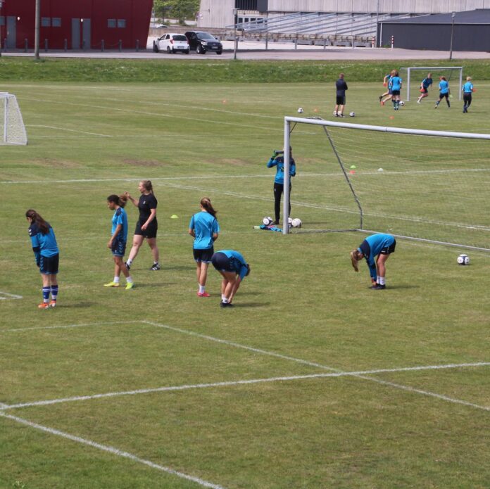 U18 DM pigerne må igen mødes med holdkammeraterne for at træne igen, hvis de deler sig op i grupper af 9. De ved dog endnu ikke, om de må genoptage U 18 DM-ligaen. Foto: Brøndby IF Pigetalent Facebook.