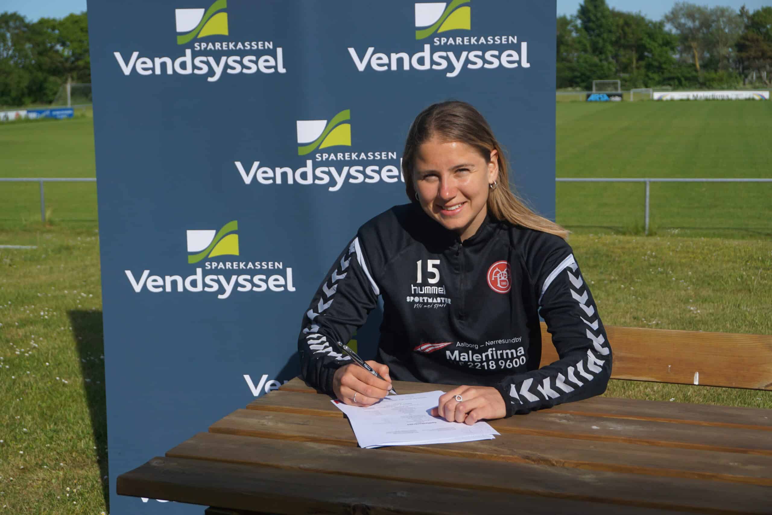 Laura Frank skriver under på kontrakten. Foto: AaB