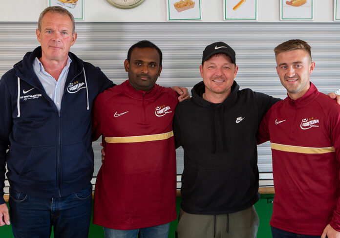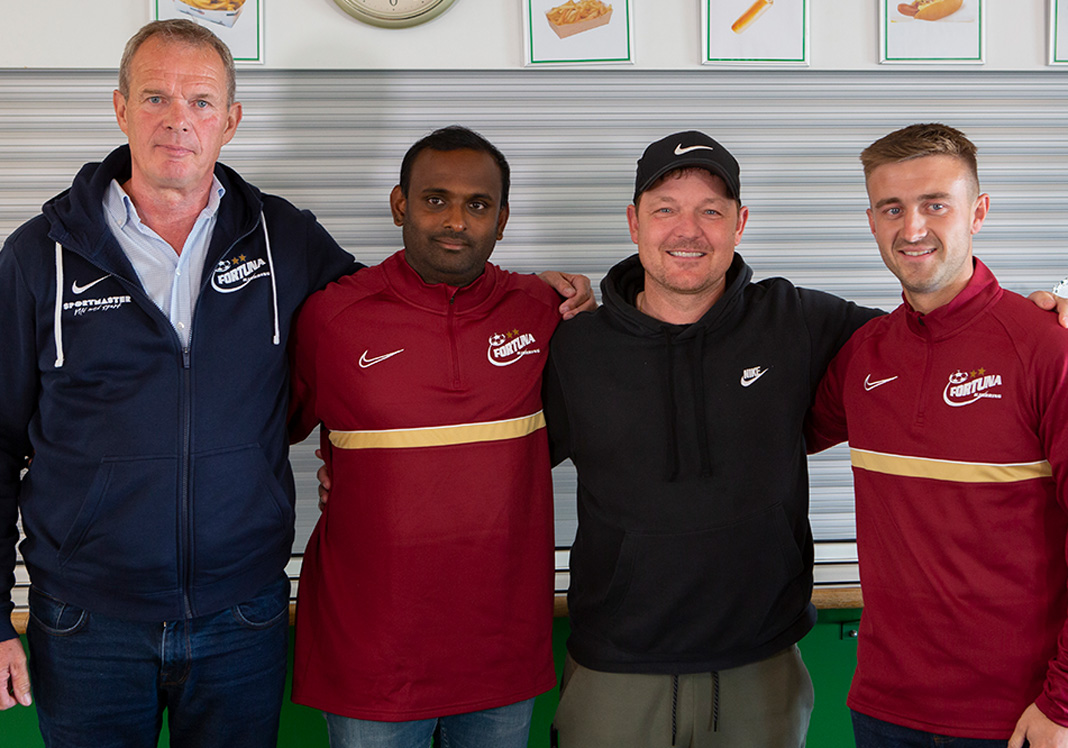 Formanden for Fortuna a-s, Kim Brix, med den nye cheftræner Martin Møller Kristensen, afgående cheftræner Brian Sørensen samt ny assistenttræner Mathias Bengtsson. Foto: Jess M. Madsen