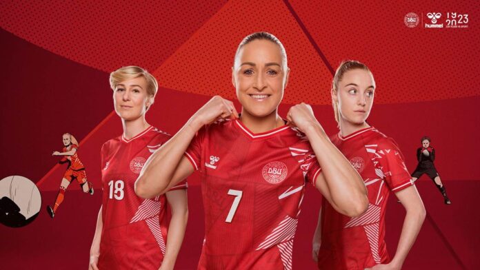 Sådan ser de ud, de røde og hvide trøjer, som kvindelandsholdet trækker i, når de til sommer skal slås for de danske farver ved VM-slutrunden i Australien og New Zealand.