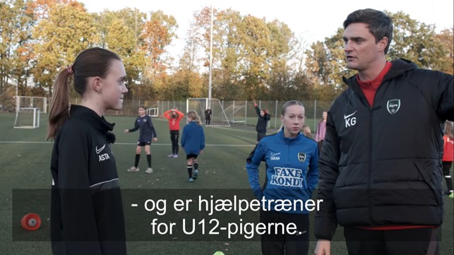Hun spiller selv på U15-holdet og er en del af trænerteamet for U12-holdet. Hun er træner sammen med Sarah og fortæller om træningen: