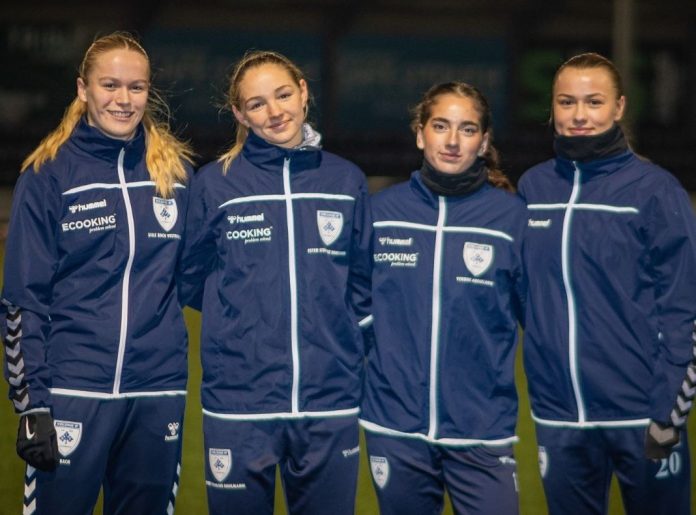 Sille Bach, Mille Larsen, Ester Dahlmann og Verona Abdullahu er nu en fast del af kvindeligatruppen hos Kolding IF. Foto: Kolding IF