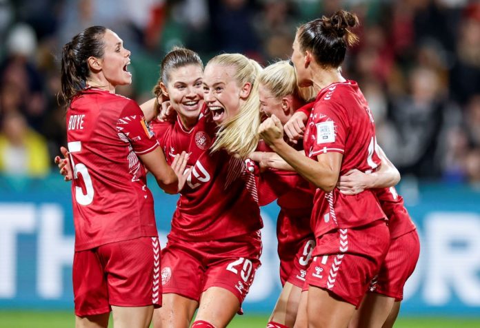 "Vejle er en stor fodboldby, og jeg er sikker på, at vi vil få nogle fantastiske rammer og en stor opbakning fra de danske fans," siger Amalie Vangsgaard, som her jubler med holdkammeraterne efter en scoring. Foto: Anders Kjærbye, fodboldbilleder.dk