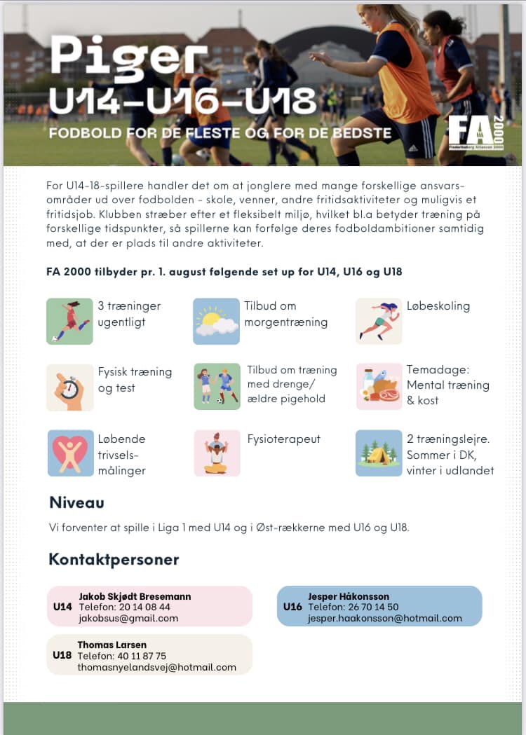 I FA 2000 vil vi gerne forbedre og skærpe vores tilbud til medlemmerne i pige- og kvindeafdelingen. Vi har derfor arbejdet på, hvordan vi skal udforme vores set up efter sommerferien.