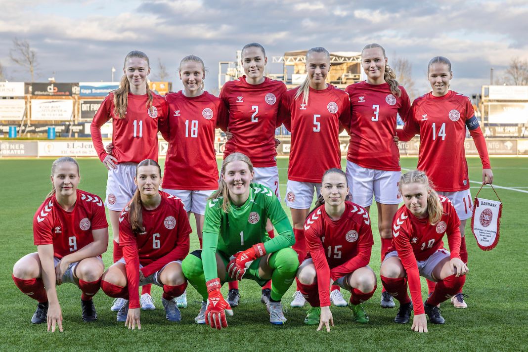 Jóhanna Fossdalsá har fået debut på kvindelandsholdet i 2024. Her ses hun fra en kamp med U19-landsholdet i 2023 (Jóhanna Fossdalsá er nummer to fra venstre i bagerste række). Foto: ©Claus Birch - dbufoto.dk